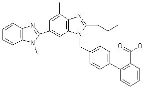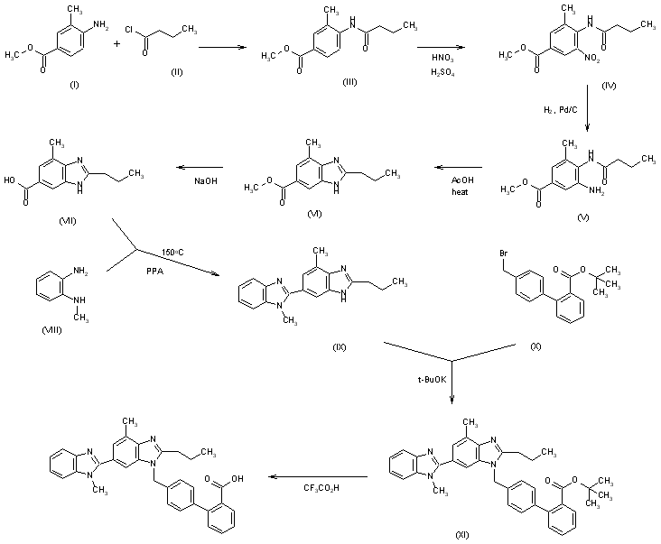 The acylation of 4-amino-3-methylbenzoic acid methyl ester (I) with butyryl chloride (II) in hot chlorobenzene gives the corresponding amide (III), which is nitrated with HNO3/H2SO4 yielding 4-butyramido-3-methyl-5-nitrobenzoic acid methyl ester (IV). The hydrogenation of (IV) with H2 over Pd/C in methanol affords the expected amino compound (V), which is cyclized in refluxing acetic acid to 2-propyl-4-methylbenzimidazole-6-carboxylic acid methyl ester (VI). The hydrolysis of (VI) with NaOH in refluxing methanol/water affords the corresponding free acid (VII), which is cyclized with N-methyl-o-phenylenediamine (VIII) by means of polyphosphoric acid (PPA) at 150 C, giving 4-methyl-6-(1-methylbenzimidazol-2-yl)-2-propylbenzimidazole (IX). The condensation of (IX) with 4'-(bromomethyl)biphenyl-4-carboxylic acid tert-butyl ester (X) by means of potassium tert-butoxide in DMSO yields the tert-butyl ester (XI), which is finally hydrolyzed with trifluoroacetic acid.