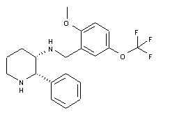 The title compound was synthesized starting from the known drug CP-99,994 (I), which was subjected to catalytic hydrogenolysis of the N-(2-methoxybenzyl) group to yield (S,S)-3-amino-2-phenylpiperidine (II). Subsequent reductive alkylation of amine (II) with 2-methoxy-5-trifluoromethoxybenzaldehyde (III) in the presence of either NaBH3CN or NaBH(OAc)3 furnished the title compound.