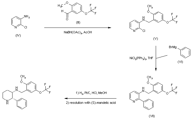 In an alternative procedure, the reductive alkylation of 3-amino-2-chloropyridine (IV) with 2-methoxy-5-trifluoromethoxybenzaldehyde (III) in the presence of NaBH(OAc)3 produced the 3-(benzylamino)pyridine (V). The 2-phenyl pyridine derivative (VII) was then prepared by chloride displacement with phenylmagnesium bromide (VI) in the presence of bis(triphenylphosphino)nickel(II) chloride. Catalytic hydrogenation of pyridine (VII) produced the racemic cis-piperidine, which was finally resolved into the enantiomers by using (S)-mandelic acid.