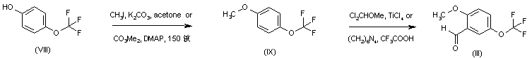 The precursor 2-methoxy-5-trifluoromethoxybenzaldehyde (III) was prepared as follows. Alkylation of 4-(trifluoromethoxy)phenol (VIII) by means of iodomethane and K2CO3 or dimethyl carbonate and DMAP furnished 4-(trifluoromethoxy)anisole (IX). Formylation of (IX) to the target aldehyde (III) was achieved by treatment with dichloromethyl methyl ether and TiCl4 or with hexamethylenetetraamine and trifluoroacetic acid.