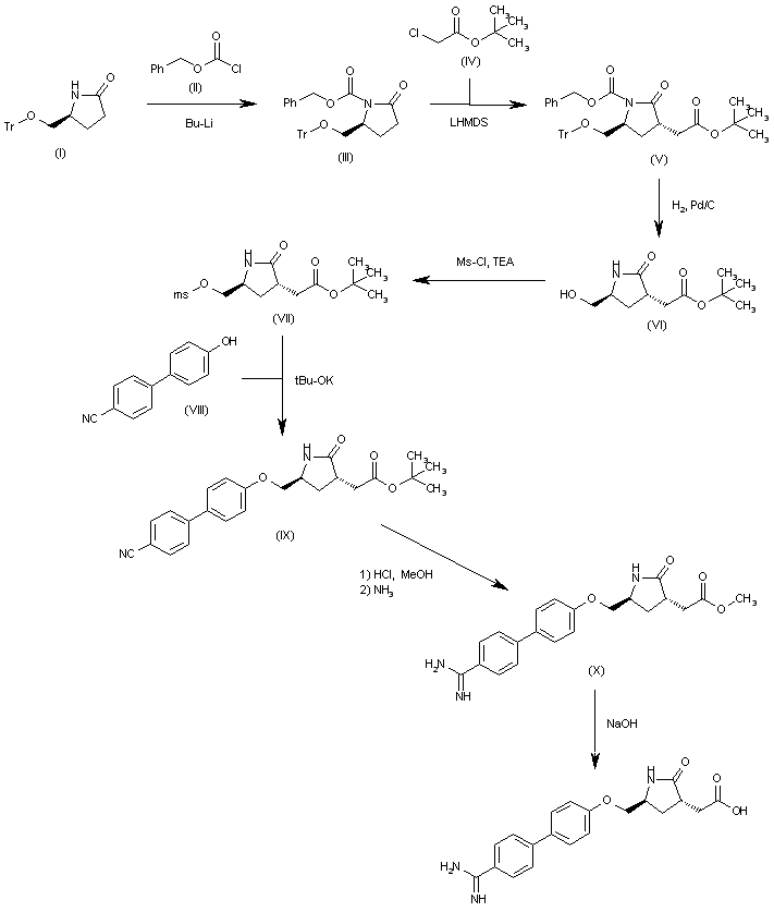 The condensation of 5(S)-(trityloxymethyl)-2-pyrrolidinone (I) with benzyl chloroformate (II) and BuLi in THF gives the carbamate (III), which is alkylated with tert-butyl 2-chloroacetate (IV) and LHMDS in THF to yield 2-[1-(benzyloxycarbonyl)-2-oxo-5(S)-(trityloxymethyl)pyrrolidin-2(S)-yl]acetic acid tert-butyl ester (V). The hydrogenation of (V) with H2 over Pd/C in hot tert-butanol affords 2-[5(S)-(hydroxymethyl)-2-oxopyrrolidin-2(S)-yl]acetic acid tert-butyl ester (VI), which is treated with MsCl and TEA in dichloromethane to provide the methanesulfonate (VII). The condensation of (VII) with 4'-hydroxybiphenyl-4-carbonitrile (VIII) by means of potassium tert-butoxide in DMF gives the adduct (IX), which by treatment with HCl in methanol and with ammonia in the same solvent yields 2-[5(S)-(4'-amidinobiphenyl-4-yloxymethyl)-2-oxopyrrolidin-3(S)-yl]acetic acid methyl ester (X). Finally, this compound is hydrolyzed with NaOH in methanol to afford the target acetic acid derivative.