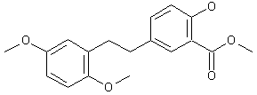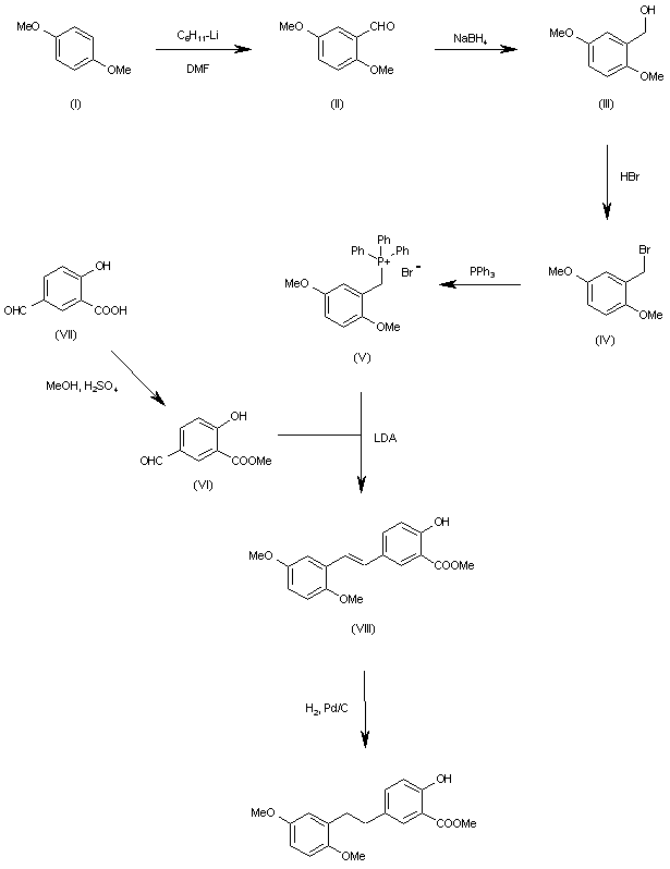 The formylation of 1,4-dimethoxybenzene (I) with C6H11-Li, TMEDA and DMF gives 2,5-dimethoxybenzaldehyde (II), which is reduced with NaBH4 to the corresponding alcohol (III). The treatment of (III) with HBr affords the benzyl bromide (IV), which by reaction with PPh3 in hot toluene is converted into the phosphonium salt (V). The condensation of (V) with 5-formyl-2-hydroxybenzoic acid methyl ester (VI)(obtained by esterification of the corresponding acid (VII) with methanol and H2SO4) by means of LDA in THF affords the stilbene (VIII). Finally, this compound is reduced with H2 over Pd/C in ethyl acetate.