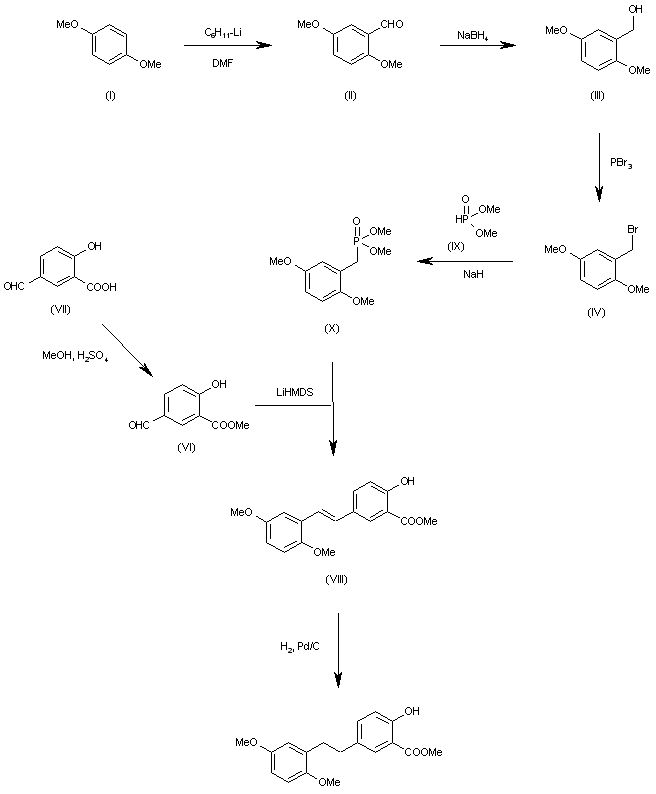 Improved large scale synthesis: The formylation of 1,4-dimethoxybenzene (I) with C6H11-Li, TMEDA and DMF gives 2,5-dimethoxybenzaldehyde (II), which is reduced with NaBH4 in toluene/methanol to the corresponding alcohol (III). The treatment of (III) with PBr3 in ethyl acetate affords the benzyl bromide (IV), which by reaction with dimethyl phosphite (IX) and NaH in toluene is converted into the phosphonate (X). The condensation of (X) with 5-formyl-2-hydroxybenzoic acid methyl ester (VI)(obtained by esterification of the corresponding acid (VII) with methanol and H2SO4) by means of LiHMDS in THF affords the stilbene (VIII). Finally, this compound is reduced with H2 over Pd/C in ethyl acetate.