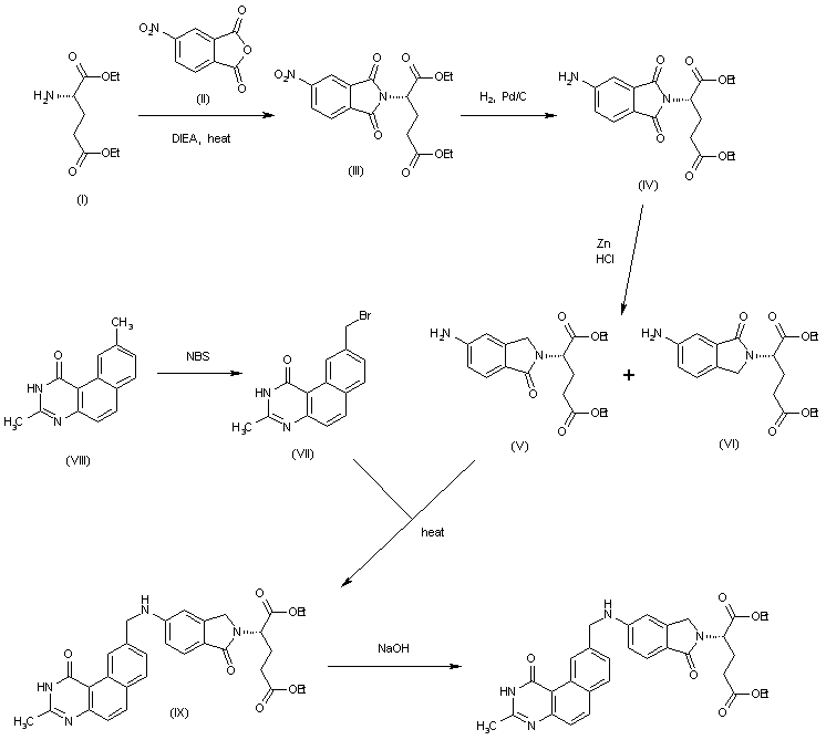 The condensation of L-glutamic acid diethyl ester (I) with 4-nitrophthalic anhydride (II) by means of DIEA in refluxing toluene gives the 4-nitrophthalimide (III), which is reduced with H2 over Pd/C to yield the 4-aminophthalimide (IV). The reduction of (IV) with Zn/HCl in ethanol affords a 3:1 mixture of the 5-aminoisoindolinone (V) and 6-aminoisoindolinone (VI) that is separated by chromatography. The desired isomer (V) is condensed with 9-(bromomethyl)-3-methylbenzo[f]quinazolin-1(2H)-one (VII) (obtained by bromination of 3,9-dimethylbenzo[f]quinazolin-1(2H)-one (VIII) with NBS) in DMF at 110?C to provide the precursor (IX). Finally, the ester groups of (IX) are hydrolyzed with NaOH in methanol.
