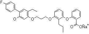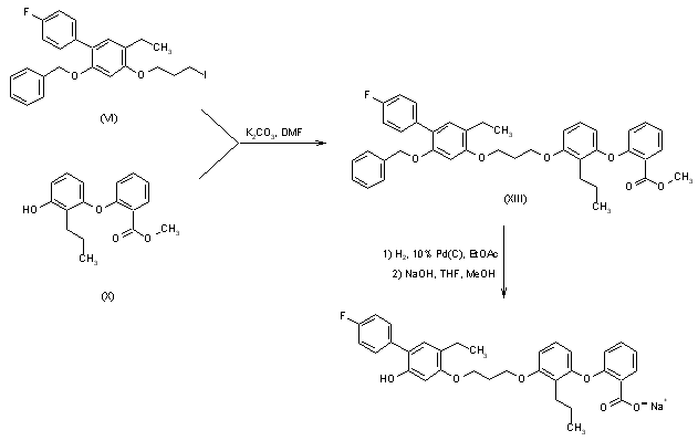 The final coupling of fragments (VI) and (X) to give (XIII) is shown in Scheme 19757001c, and is accomplished in the presence of potassium carbonate in N,N-dimethylformamide. The final deprotection sequence is effected by hydrogenolysis of the benzyl ether followed by hydrolysis of the resulting ester to provide LY293111 as the sodium salt.
