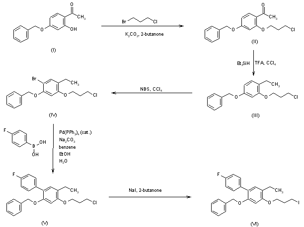 The biphenyl side chain of LY293111 can be constructed as illustrated in Scheme 19757001a: 4-Benzyloxy-2-hydroxyacetophenone (I) is alkylated with 1-bromo-3-chloropropane to provide compound (II). Reduction of the keto group with triethylsilane in trifluoroacetic acid provides (III), which is then regiospecifically brominated with N-bromosuccinimide to give (IV). A Suzuki biaryl coupling of (IV) with 4-fluorophenylboronic acid is used to prepare chloride (V), which is treated with sodium iodide in refluxing 2-butanone to give intermediate iodide (VI).