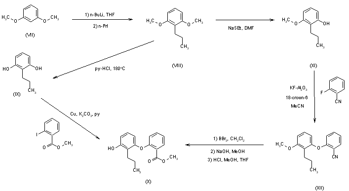 The key diaryl ethyl fragment of LY293111 begins with the deprotonation and alkylation of 1,3-dimethoxybenzene (VII) to provide compound (VIII). Two routes may be used to construct the diaryl ether phenol (X). The first route, utilizing an Ullmann ether synthesis, begins with the demethylation of (VIII) with molten pyridinium hydrochloride to give diol (IX). Subsequent coupling of (IX) with methyl 2-iodobenzoate in the presence of copper and potassium carbonate in refluxing pyridine provides the target phenol (X). In the alternative route, compound (VIII) is mono-demethylated with sodium ethanethiolate in hot N,N-dimethylformamide to provide phenol (XI). The addition of 2-fluorobenzonitrile to (XI), mediated by potassium fluoride-alumina and 18-crown-6 in refluxing acetonitrile, provides nitrile (XII). Boron tribromide-assisted demethylation of (XII), followed by hydrolysis and esterification, completes the alternate synthesis of intermediate (X).