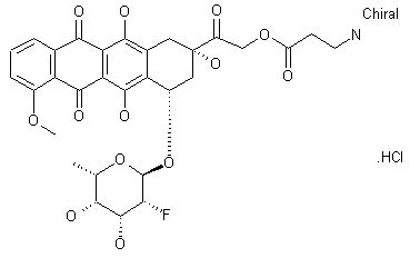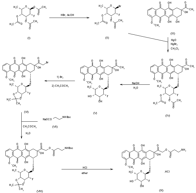 Coupling of daunomycinone (III) with 3,4-di-O-acetyl-2,6-dideoxy-2-fluoro-alpha-L-talopyranosyl bromide (II), which was obtained from 1,3,4-tri-O-acetyl-derivative (I), was performed by a Koenings-Knorr type of reaction to obtain the daunomycin derivative (IV). Deprotection of (IV) with sodium hydroxide in water gave corresponding derivative (V), which was subsequently treated with bromine in dichloromethane and acetone to afford the bromo derivative (VI). Condensation of (VI) with N-Boc-beta-alanine sodium salt (VII) in acetone/water gave the protected beta-alaninate derivative (VIII), which was finally treated with hydrochloride in ether to obtain DA-125.