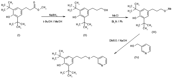 Nicanartine is readily accessible by a direct ether coupling reaction of 3-(hydroxymethyl)pyridine (IV) with 3-(3,5-di-tert-butyl-4-hydroxyphenyl)propyl mesylate (III) under classical Williams-type reaction conditions. 3-(3,5-Di-tert-butyl-4-hydroxyphenyl)propyl mesylate (III) in turn is prepared in good yields by a straightforward two-step reaction sequence (reduction, mesylation), starting from the commercially available antioxidant methyl 3-(3,5-di-tert-butyl-4-hydroxyphenyl)propanoate (I) (Ionox 520(TM)).