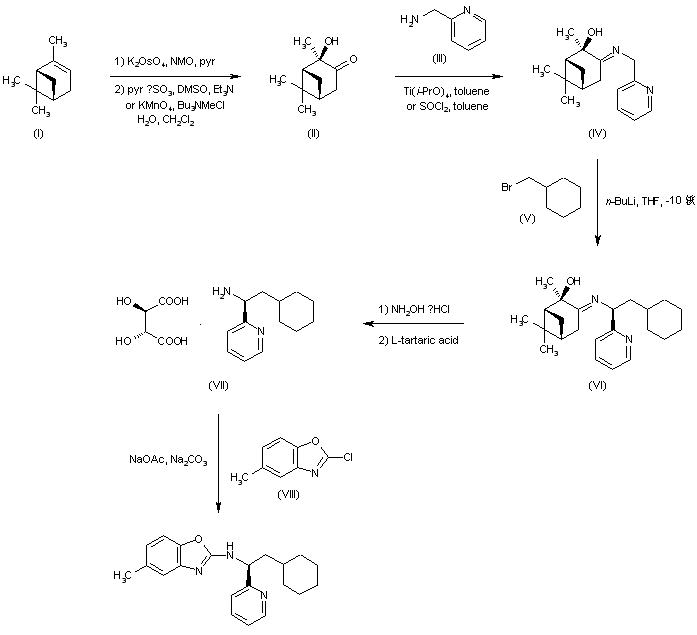The required chiral auxiliary hydroxyketone (II) was prepared from (S)-alpha-pinene (I) either by dihydroxylation with K2OsO4 and NMO, followed by Swern oxidation of the secondary alcohol, or by direct oxidation using KMnO4 under phase-transfer conditions. Condensation of (II) with 2-(aminomethyl)pyridine (III) in the presence of titanium isopropoxide or thionyl chloride as the dehydrating reagents provided the chiral imine (IV), which was estereoselectively alkylated with cyclohexylmethyl bromide (V) and n-BuLi, yielding (VI). Cleavage of the chiral auxiliary of (VI) was carried out by treatment with hydroxylamine hydrochloride. Enantiomeric enrichment of the resulting (S)-pyridylamine was achieved by recrystallization of the corresponding L-tartrate salt (VII). Finally, the amine was condensed with chlorobenzoxazole (VIII) in the presence of NaOAc and Na2CO3 in refluxing methylcyclohexane.