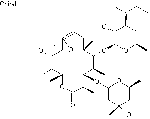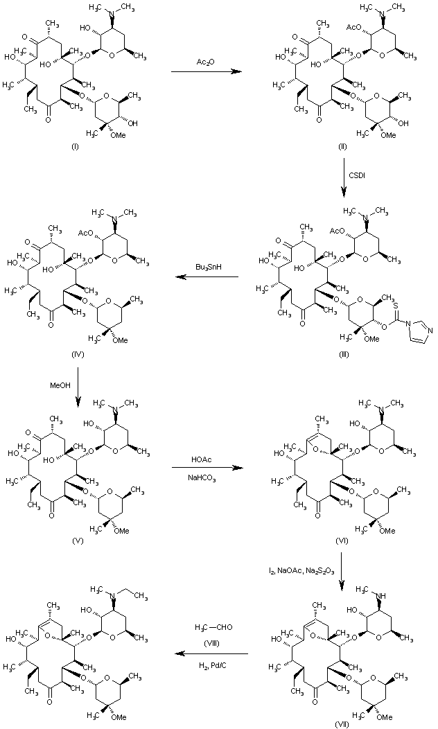 The selective acetylation of erythromycin B (I) with acetic anhydride in methylene chloride gives the 2'-O-acetyl derivative (II), which is treated with thiocarbonyldiimidazole (CSDI) and DMAP in dichloromethane to yield the 4''-O-thiocarbonyl derivative (III). The reduction of (III) with Bu3SnH in refluxing toluene affords 2'-O-acetyl-4''-deoxyerythromycin B (IV), which is deacetylated in refluxing methanol giving 4''-deoxyerythromycin B (V). The reaction of (V) with AcOH and NaHCO3 yields the hemiketal (VI), which is demethylated at the NMe2 group by means of I2, NaOAc and Na2S2O3 affording the methylamino compound (VII). Finally, this compound is submitted to a reductive alkylation with acetaldehyde (VII) and H2 over Pd/C in methanol.