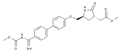 The condensation of 5(S)-(trityloxymethyl)-2-pyrrolidinone (I) with benzyl chloroformate (II) and BuLi in THF gives the carbamate (III), which is alkylated with tert-butyl 2-chloroacetate (IV) and LHMDS in THF to yield 2-[1-(benzyloxycarbonyl)-2-oxo-5(S)-(trityloxymethyl)pyrrolidin-2(S)-yl]acetic acid tert-butyl ester (V). The hydrogenation of (V) with H2 over Pd/C in hot tert-butanol affords 2-[5(S)-(hydroxymethyl)-2-oxopyrrolidin-2(S)-yl]acetic acid tert-butyl ester (VI), which is treated with MsCl and TEA in dichloromethane to provide the methanesulfonate (VII). The condensation of (VII) with 4'-hydroxybiphenyl-4-carbonitrile (VIII) by means of potassium tert-butoxide in DMF gives the adduct (IX), which by treatment with HCl in methanol, and with ammonia in the same solvent yields 2-[5(S)-(4'-amidinobiphenyl-4-yloxymethyl)-2-oxopyrrolidin-3(S)-yl]acetic acid methyl ester (X). Finally, this compound is condensed with methyl chloroformate (XI) by means of NaOH in dichloromethane to afford the target compound.