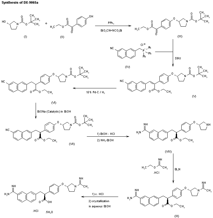 Condensation of the (3R)-3-pyrrolidinol (I) and the phenylglyoxylate (II) using a procedure described by Bittner gave the (3S)-alpha-keto-ester (III). Wittig reaction of the (3S)-alpha-keto-ester (III) and the phosphonium salts (IV) using 1,8-diazabicyclo[5.4.0]undec-7-ene (DBU) as a base, followed by catalytic hydrogenation gave the ethyl propanoate derivatives (VI) as an equivalent mixture of two diastereoisomers. The mixture (VI) gave the pure (2S,3'S)-isomer (VII) by means of crystallization in ethanol. Pinner synthesis was applied for the single isomer (VII) to give the amidine (VIII). Treatment of the amidine (VIII) with ethyl acetimidate hydrochloride yielded the N-acetimidoyl derivative (IX). Conversion of (IX) to the final product, DX-9065a, was accomplished by acidic hydrolysis followed by crystallization. The absolute configuration of DX-9065a was assigned as (2S,3'S) based on X-ray crystallographic analysis and the (3'S) configuration of the 3 position on the pyrrolidine ring.