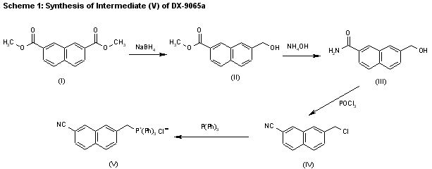 Synthesis of intermediate (V) of DX-9065a: Compound (V) has been obtained as follows: The reaction of 7-methoxy-1,2,3,4-tetrahydronaphthalen-2-one (VII) with trimethylsilyl cyanide using BF3 ethearate as catalyst gives 7-methoxy-3,4-dihydronaphthalene-2-carbonitrile (VIII), which is aromatized with sulfur and Pd/C to naphthalene (IX). The demethylation of (IX) with BBr3 in dichloromethane affords 7-hydroxynaphthalene-2-carbonitrile (X), which is finally converted into the triflate (V) with PhN(SO2CF3)2 as triflating agent. Alternatively, the triflation of 7-methoxy-2-naphthol (XI) as before gives the triflate (XII), which is converted into the previously obtained carbonitrile (IX) by reaction with Zn(CN)2 catalyzed by triphenylphosphine and palladium acetate in hot 1-methyl-2-pyrrolidone.