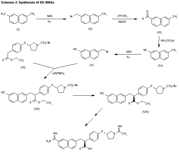The bromination of 2,7-dimethylnaphthalene (I) with N-bromosuccinimide (NBS) and UV light in CCl4 gives the monobromo derivative (II), which is treated with 2-nitropropane/NaOMe to yield 7-methylnaphthalene-2-carbaldehyde (III). The reaction of (III) with hydroxylamine-O-sulfonic acid affords the nitrile (IV), which is brominated with NBS as before to give 7-(bromomethyl)naphthalene-2-carbonitrile (V). The condensation of (V) with 2-[4-[1-(tert-butoxycarbonyl)pyrrolidin-3(S)-yloxy]phenyl]acetic acid ethyl ester (VI) by means of lithium bis(trimethylsilyl)amide yields 2-[4-[1-(tert-butoxycarbonyl)pyrrolidin-3(S)-yloxy]phenyl]-3-(7-cyano-2-naphthyl)propionic acid ethyl ester (VII) as a diastereomeric mixture. This mixture was worked up as already described to obtain the target compound DX-9065a.