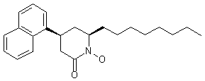 Treatment of 5-(1-naphthyl)cyclohexane-1,3-dione (I) with 2,2-dimethoxypropane and MeOH in the presence of p-toluenesulfonic acid provided enol ether (II). Condensation of (II) with n-octylmagnesium bromide in cold THF, followed by acidic treatment of intermediate (III) yielded enone (IV). The subsequent oxidative cleavage of (IV) with NaIO4 and a catalytic amount of ruthenium oxide gave ketoacid (V), which was converted into the oxime (VI) on treatment with hydroxylamine. Reduction of oxime (VI) with NaBH4 in AcOH gave the hydroxylamine (VII). Then, cyclization to the piperidone acid in the presence of silica gel in refluxing benzene, followed by chromatographic separation of the cis isomer, provided the target compound.