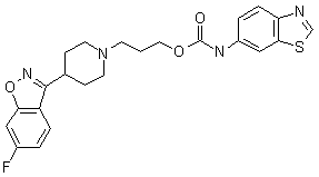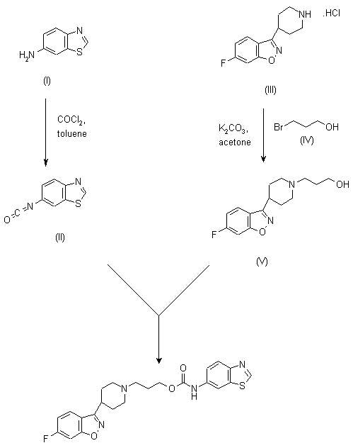 Reaction of 6-aminobenzothiazole (I) with phosgene in refluxing tolene affords isocyanate (II). Alkylation of 6-fluoro-3-(4-piperidinyl)-1,2-bensisoxazole hydrochloride (III) with 3-bromopropanol (IV) in the presence of potassium carbonate in acetone gave alcohol (V). Finally, condensation of this alcohol (V) with isocyanate (II) in DMF at 100 C yielded the title carbamate.