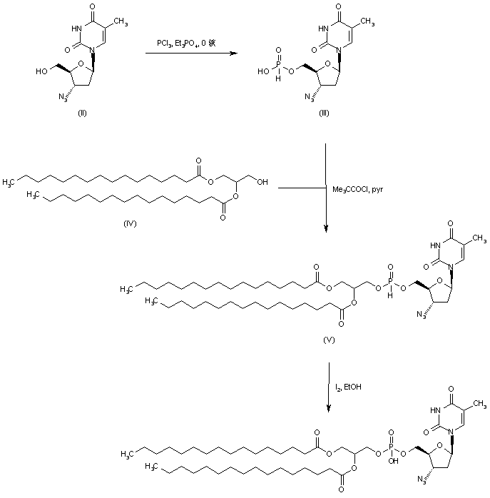 3'-azido-3'-deoxythimidine (II) was phosphitylated with phosphorus trichloride in triethyl phosphate to yield the corresponding hydrogen phosphonate (III). Subsequent coupling of (III) with 1,2-dipalmitoylglycerol (IV) by means of pivaloyl chloride in pyridine produced phosphite ester (V), which was finally oxidized to the title phosphate with ethanolic iodine.