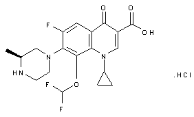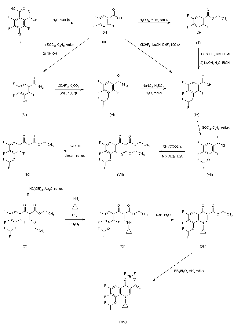 Decarboxylation of 3,5,6-trifluoro-4-hydroxyphthalic acid (I) upon heating at 140 C in an autoclave furnished 2,4,5-trifluoro-3-hydroxybenzoic acid (II). This was converted to ethyl ester (III) by refluxing in EtOH in the presence of H2SO4. Condensation of (III) with chlorodifluoromethane and NaH in hot DMF produced the corresponding difluoromethyl ether, and subsequent basic hydrolysis of the ethyl ester yielded 3-(difluoromethoxy)-2,4,5-trifluorobenzoic acid (IV). Alternatively, acid (II) was converted to acid chloride with SOCl2 and subsequently condensed with ammonia to give amide (V). After formation of the difluoromethyl ether (VI) under similar conditions as above, acid (IV) was obtained by diazotization of the amide function of (VI) in hot sulfuric acid. The difluoromethoxy acid (IV) was also prepared by direct alkylation of hydroxy acid (II) with chlorodifluoromethane in the presence of NaOH in hot DMF. Acid (IV) was activated as the corresponding acid chloride (VII) with SOCl2. Condensation of acid chloride (VII) with the magnesium salt of diethyl malonate gave rise to the benzoylmalonate (VIII). Further decarbethoxylation of (VIII) by heating in the presence of p-toluenesulfonic acid yielded keto ester (IX). This was condensed with triethyl orthoformate in the presence of Ac2O to give the ethoxyacrylate (X), which was converted to enamine (XII) by treatment with cyclopropylamine (XI). The target quinolone system (XIII) was then obtained by intramolecular cyclization of (XII) in the presence of NaH. Then, ethyl ester (XII) cleavage using boron trifluoride etherate provided the key quinolonecarboxylic acid boron chelate (XIV)