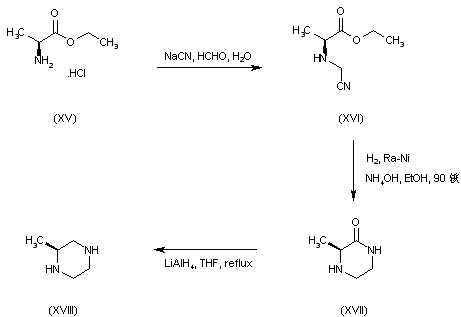 The chiral piperazine building block (XVIII) was prepared as follows. L-Alanine ethyl ester (XV) was condensed with formaldehyde and NaCN to give the amino nitrile (XVI). Catalytic hydrogenation of the cyano group of (XVI) with simultaneous intramolecular cyclization furnished the piperazinone (XVII). This was reduced to the target (S)-2-methylpiperazine (XVIII) by means of LiAlH4 (1).