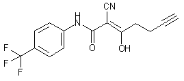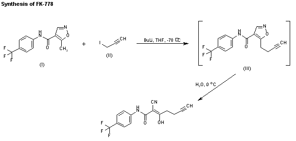 FK-778 is obtained by selective alkylation of leflunomide (I) at the methyl group with propargyl iodide (II) by means of butyl lithium in THF at ?8 C to give N-(4-trifluoromethylphenyl)-5-(3-butynyl)isoxazole-4-carboxamide (III), which is finally treated with water at 0 C.