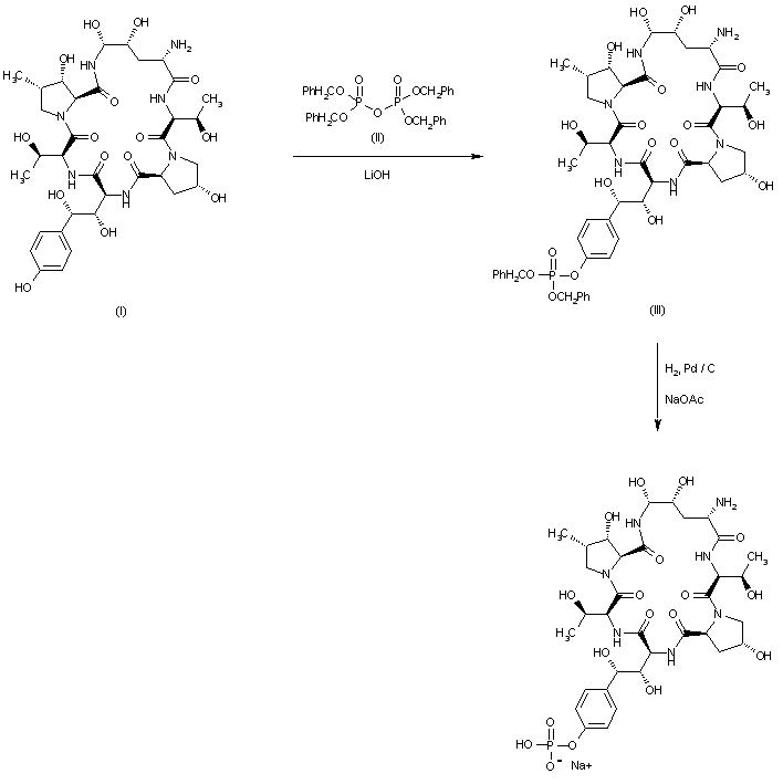 The synthesis of LY-307853 (the phosphate prodrug of LY-303366) has been performed: The phosphorylation of LY-303366 (I) with tetrabenzyl pyrophosphate (II) by means of LiOH in DMF gives dibenzyl phosphate (III), which is finally debenzylated by hydrogenation with H2 over Pd/C in the presence of sodium acetate.