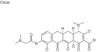 This compound can be obtained by two related ways: 1) The nitration of minocycline (I) by means of NaNO3 and H2SO4 gives the 9-nitro derivative (II), which is hydrogenated with H2 over Pd/C in 2-methoxyethanol to yield the 9-amino derivative (III). Finally, this compound is acylated with sarcosyl chloride (IV) by means of Na2CO3 in acetonitrile/dimethylpropylenurea. 2) The acylation of the 9-amino derivative (III) with N-(succinimidyloxycarbonyl)carbamic acid tert-butyl ester (V) by means of sodium acetate in THF gives the 9-(tert-butoxycarbonyl)glycylamino substituted compound (VI), which is deprotected with trifluoroacetic acid to afford the 9-glycylamino compound (VII). Finally, this compound is methylated with formaldehyde and simultaneous hydrogenation with H2 over Pd/C in 2-methoxyethanol.