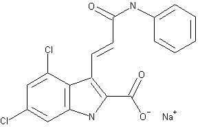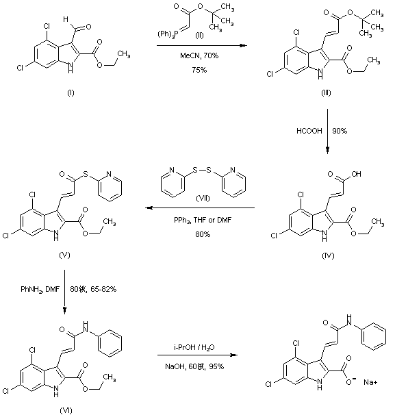 GW150526 was easily prepared starting from the known 3-unsubstituted indole derivative (IV) following the general synthetic route described in Scheme 20235901a. The known indole derivative (IV) was formylated at the C-3 position according to the well known Vilsmaier-Haack procedure obtaining the intermediate (VI) in high yield. The subsequent Wittig-type olefination reaction afforded the compound (VII) with high regio control in the formation of the olefinic moiety. The hydrolysis of the ethyl ester group afforded GV-150526 as sodium salt derivative.