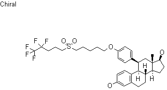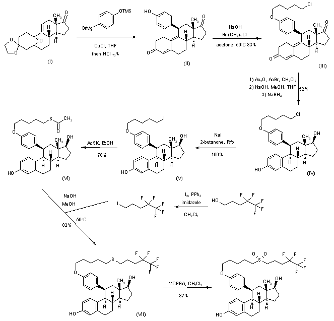 RU 58668 can be prepared according to the multistep synthesis described in Scheme 20326301a. It starts with the copper(I) catalyzed regiospecific addition of the Grignard reagent derived from 4-bromophenol, protected as its trimethylsilyl ether, on the 5alpha,10alpha-epoxyestr-9(11)-ene-3,17-dione 3-(1,2-ethanediyl) cyclic acetal (I). The acidic treatment of the crude 11beta-aryl-5alpha-hydroxyestr-9-ene-3,17-dione cyclic acetal thus produced yielded the 11beta-(4-hydroxyphenyl)estradienedione (II), by simultaneous desilylation, deketalization of the 3-keto group and dehydration. Alkylation of the phenolic hydroxyl group was performed using 1-bromo-5-chloropentane, with aqueous sodium hydroxide in acetone yielding (III). The A-ring of the chloropentyl ether (III), was aromatized by treatment with a mixture of acetyl bromide and acetic anhydride in dichloromethane. The phenolic acetate obtained was immediately submitted to saponification followed by reduction of the 17-keto group with sodium borohydride, leading to the formation of the crystalline chlorinated estradiol derivative (IV). Halogen exchange with sodium iodide gave rise to the formation of the iodo derivative (V). The sulfur atom was introduced by substitution with potassium thioacetate, to produce the thioester (VI). Saponification of the acetate generated the sodium thiolate, which was immediately alkylated with 5-iodo-1,1,1,2,2-pentafluoropentane (obtained through the iodination of the corresponding pentafluoropentanol), yielding the sulfide (VII). Oxidation of the latter compound followed by chromatography and recrystallization afforded pure RU 58668.