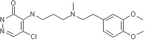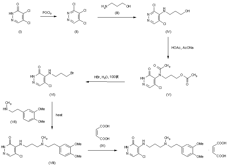 Pyridazinone (I) was converted to 3,4,5-trichloropyridazine (VIII) on treatment with POCl3. Nucleophylic substitution in (II) with 3-aminopropanol (III) gave, after crystallization, the desired isomer (IV). Hydrolysis of the 3-chloro group of (IV) was carried out with AcOH and AcONa, resulting in the N,O-diacetyl derivative (V). Subsequent reaction of (V) with aqueous HBr provided bromide (VI), which was then treated with N-methyl homoveratrylamine (VII) to furnish the target compound (VIII). This compound was finally isolated as the fumarate salt on treatment with fumaric acid in EtOH (1).