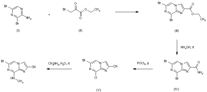 The precursor imidazopyrazine (III) was prepared by condensation of 2-amino-3,5-dibromopyrazine (I) with ethyl 3-bromopyruvate (II). Subsequent treatment of ester (III) with aqueous ammonia produced the corresponding amide (IV). This was then dehydrated with phosphoryl chloride, with concomitant displacement of the 8-bromine for a chloro group, to yield nitrile (V). Finally, substitution of the chloride by methyl amine in (V) furnished the target compound.