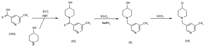 The key intermediate (VI) is synthesized through the condensation of 5-methylnicotinic acid (VIII) with 4-hydroxypiperidine by means of DCC in DMF to give amide (IX), followed by reduction with POCl3 and NaBH4 to give the amino alcohol (X), which is treated with SOCl2.