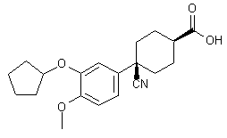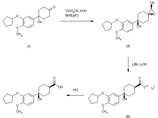 The reaction of 3-cyclopentyloxy-4-methoxybenzaldehyde (I) with LiBr, trimethylsilyl chloride (TMS-Cl) and 1,1,3,3-tetramethyldisiloxane in acetonitrile gives the corresponding benzyl bromide (II), which by reaction with NaCN in DMF affords 2-(3-cyclopentyloxy-4-methoxyphenyl)acetonitrile (III). The condensation of (III) with methyl acrylate (IV) by means of Triton B in refluxing acetonitrile yields the 4-cyanopimelate (V), which is cyclized by means of NaH in refluxing DME, giving the 2-oxocyclohexanecarboxylic ester (VI). The decarboxylation of (VI) by means of NaCl in DMSO/water at 150 C yields the cyclohexanone (VII), which is condensed with 2-(trimethylsilyl)-1,3-dithiane (VIII) by means of BuLi in THF, affording the cyclohexylidene-dithiane (IX). The methanolysis of (IX) catalyzed by HgCl2 and HClO4 in refluxing methanol gives a mixture of the cis- and trans-4-cyano-4-(3-cyclopentyloxy-4-methoxyphenyl)cyclohexanecarboxylic acid methyl ester which is submitted to flash chromatography to obtain the cis-isomer (XII). Finally, this compound is hydrolyzed with KOH in methanol/THF/water.
