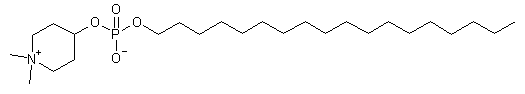 Perifosine was synthesized via a two-step process. In the first step, phosphorus oxytrichloride (I) was reacted with 4-hydroxy-1-methylpiperidine hydrochloride (II) in dichloromethane at room temperature using pyridine as auxiliary base. The resulting intermediate, without isolation, was reacted with octadecanol (III) to yield desmethyl perifosine (IV). Desmethyl perifosine was purified by recrystallization prior to methylation. The second step consisted of the methylation of desmethyl perifosine (IV), which was carried out with p-toluenesulfonic acid methyl ester in boiling ethanol using potassium carbonate as base. The crude perifosine solution that was obtained after filtration of the cooled reaction mixture was treated with ion exchange resin in order to remove remaining salts and ionic by-products. Pure perifosine was obtained after evaporation and crystallization.