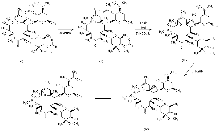The oxidation of 2'-O-acetyl-4''-O-formyl-8,9-didehydroerythromycin A 6,9-hemiacetal (I) gives the corresponding 11-oxo derivative (II), which was first methylated with NaH and methyl iodide and then hydrolyzed with NaHCO3 to yield 11-deoxy-12-O-methyl-1-oxo-8,9-didehydroerythromycin A 6,9-hemiacetal (III). The demethylation of (III) with I2 and NaOH affords the 3'-N-demethyl derivative (IV), which is finally alkylated with isopropyl iodide and diisopropylethylamine in methanol.