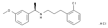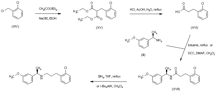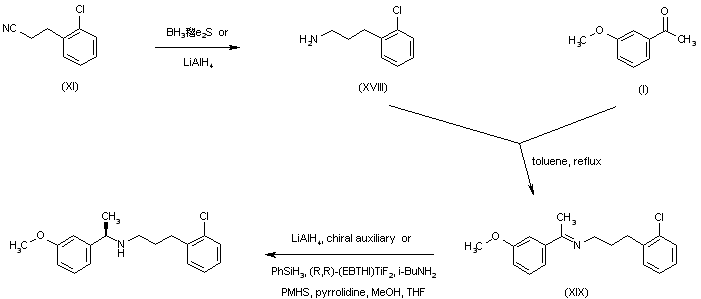 The title compound was prepared by one-pot reductive alkylation of the chiral amine (III) with 3-(2-chlorophenyl)propionitrile (XI). Reduction of nitrile (XI) by means of DIBAL at -78 C produced the intermediate diisobutylaluminium-imine complex (XII) which, after addition of (R)-3-methoxy-alpha-methylbenzylamine (III), generated imine (XIII). Subsequent reduction of imine (XIII) with NaBH4 afforded the target amine.
