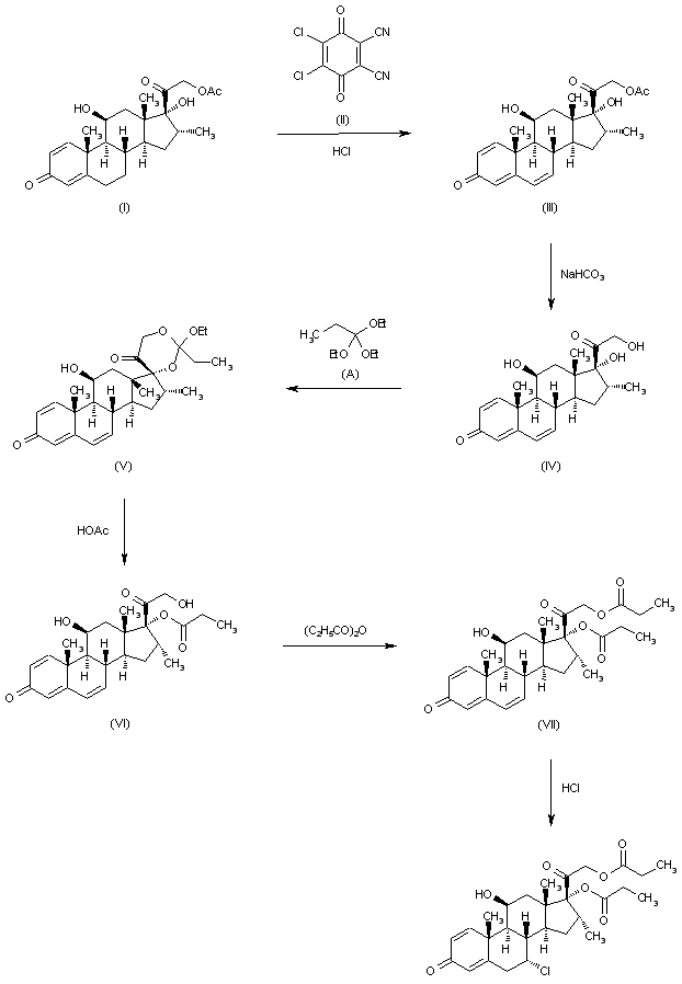 The dehydrogenation of 16alpha-methyl-17alpha,21-dihydroxypregna-1,4-diene-3,11,20-trione-21-acetate (VIII) with (II) in dioxane-HCl gives 16alpha-methyl-17alpha,21-dihydroxypregna-1,4,6-triene-3,11,20-trione-21-acetate (IX), which is hydrolyzed with aqueous NaHCO3 to the corresponding free diol (X). The reaction of (X) with triethyl orthopropionate (A) as before yields 16alpha-methyl-17alpha,21-dihydroxypregna-1,4,6-triene-3,11,20-trione-17,21-ethylorthopropionate (XI), which is hydrolyzed partially with acetic acid to 16alpha-methyl-17alpha,21-dihydroxypregna-1,4,6-triene-3,11,20-trione-17-propionate (XII). The acylation of (XII) with propionic anhydride yields the corresponding dipropionate (XIII), which is treated with dry HCl in dioxane to afford 16alpha-methyl-17alpha,21-dihydroxy-7alpha-chloropregna-1,4-diene-3,11,20-trione 17,21-dipropionate (XIV). Finally, this compound is reduced with NaSH4 in methanol - THF.