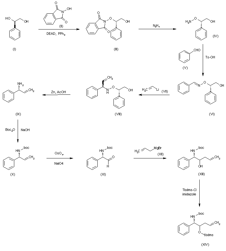 The reaction of 1(R)-phenylethane-1,2-diol (I) with N-hydroxyphthalimide (II) by means of DEAD and PPh3 gives the N-alcoxyphthalimide (III) with(S)-configuration. The hydrazinolysis of (III) with hydrazine hydrate affords the O-alkylhydroxylamine (IV), which is condensed with benzaldehyde (V) to provide the alkylated benzaldoxime (VI). The alkylation of the oxime (VI) with vinyl lithium (VII) in toluene gives the N, O dialkylated hydroxylamine (VIII), which is treated with Zn and AcOH to yield 1(R)-phenylallylamine (IX). The protection of the amine (IX) with Boc2O and NaOH affords the carbamate (X), which is oxidized at the vinyl double bond by means of OsO4 and NaIO4 to provide the acetaldehyde (XI). The reaction of aldehyde (XI) with allylmagnesium bromide (XII) in ethyl ether gives the aminoalcohol (XIII), which is protected with Tbdms-Cl and imidazole to yield the silyl ether (XIV).