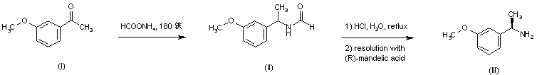 The required (R)-3-methoxy-alpha-methylbenzylamine (III) was prepared from 3?methoxyacetophenone (I) via Leuckart reaction, upon heating at 180 C with ammonium formate. The resultant formamide (II) was hydrolyzed with concentrated HCl to the racemic amine, which was then resolved using (R)-mandelic acid.
