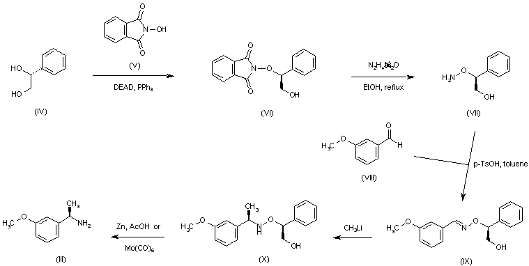 A new procedure for the asymmetric synthesis of amine (III) was reported. Mitsunobu coupling of N-hydroxyphthalimide (V) with the chiral auxiliary (R)-phenylglycol (IV) yielded the (S)-alkoxyphthalimide (VI). Hydrazinolysis of (VI) provided the free alkoxyamine (VII), which was condensed with 3-methoxybenzaldehyde (VIII) to afford oxime (IX). Diastereoselective addition of methyllithium to the oxime ether (IX) led to the methyl adduct (X) as the major isomer. Then, reductive N-O bond cleavage to furnish amine (III) was carried out by using zinc-acetic acid or, with an improved yield, using molybdenum hexacarbonyl.