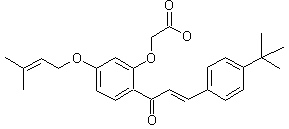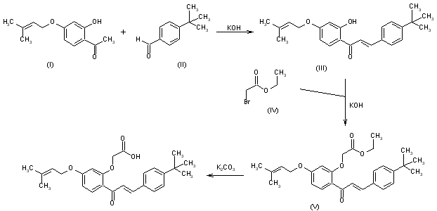 The synthesis of free compound is performed as follows: The condensation of 2-hydroxy-4-(3-methyl-2-butenyloxy)acetophenone (I) with 4-tert-butylbenzaldehyde (II) by means of KOH in hot ethanol gives 3-(4-tert-butylphenyl)-1-[4-hydroxy-4-(3-methyl-2-butenyloxy)phenyl]-2(E)-propen-1-one (III), which is condensed with ethyl bromoacetate (IV) by means of KOH in acetone to afford (E)-2-[2-(4-tert-butylcinnamoyl)-4-(3-methyl-2-butenyloxy)phenoxy] acetic acid ethyl ester (V). Finally, this compound is hydrolyzed with KOH in hot ethanol-water.