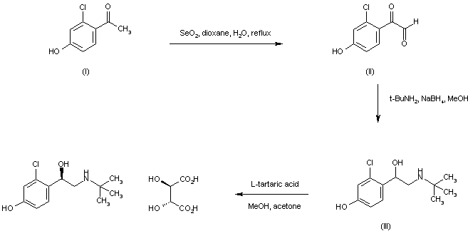 Oxidation of 2-chloro-5-hydroxyacetophenone (I) with selenium dioxide gave the phenylglyoxal derivative (II). This was subjected to reductive amination with tert-butylamine in the presence of NaBH4 to afford the racemic amino alcohol (III). After conversion of amino alcohol (III) to the L-tartrate salt, several recrystallizations from methanol-acetone provided the pure (R) enantiomer