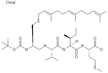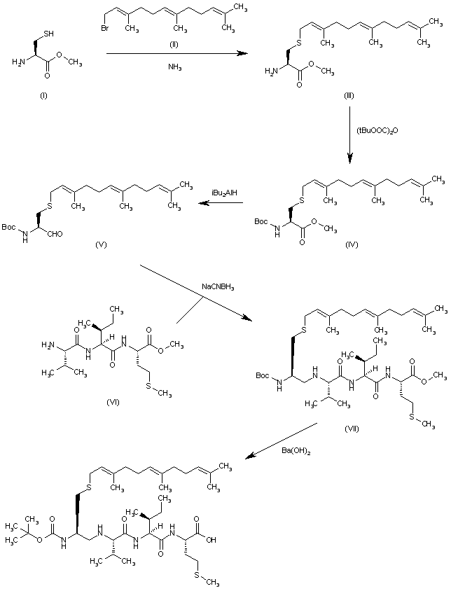 | 合成路线图解说明: The reaction of L-cysteine methyl ester (I) with farnesyl bromide (II) by means of ammonia in methanol gives the S-derivative (III), which is Boc protected as usual yielding the protected cysteine (IV). The reduction of (IV) with diisobutylaluminum hydride in toluene affords the cysteine aldehyde (V), which is reductocondensed with the tripeptide L-valine-L-isoleucine-L-methionine methyl ester (VI) by means of sodium cyanoborohydride in acidic methanol giving the peptide ester (VII). Finally, this compound is hydrolyzed with barium hydroxide in methanol/water. |