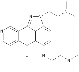 The cyclization of 9-fluoro-6-(tosyloxy)-5,10-dihydrobenzo[g]isoquinoline-5,10-dione (I) with 2-aminoethylhydrazine (II) gives 2-(2-aminoethyl)-5-(tosyloxy)indazolo[4,3-gh] isoquinolin-6(2H)-one (III), which is finally condensed with N,N-dimethylethylene-1,2-diamine (IV) to afford the title compound.