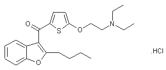 2-Butylbenzofuran (I) was acylated with 5-methoxythiophen-2-carbonyl chloride (II) in chloroform at 0 C to give the methanone compound (III). Ether cleavage of (III) was accomplished with borontribromide in chloroform to give the hydroxy compound (IV). Compound (IV) was treated with sodium methanolate and subsequently reacted with diethylaminoethylchloride in diethylcarbonate to give the alkylated product. This was treated with hydrochloric acid to yield crystaline E047/1. The final product was purified by two recrystallizations from an acetone/water mixture.