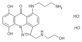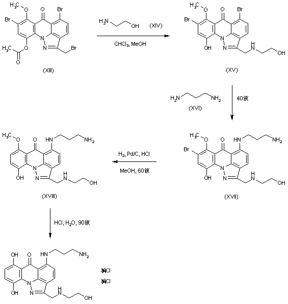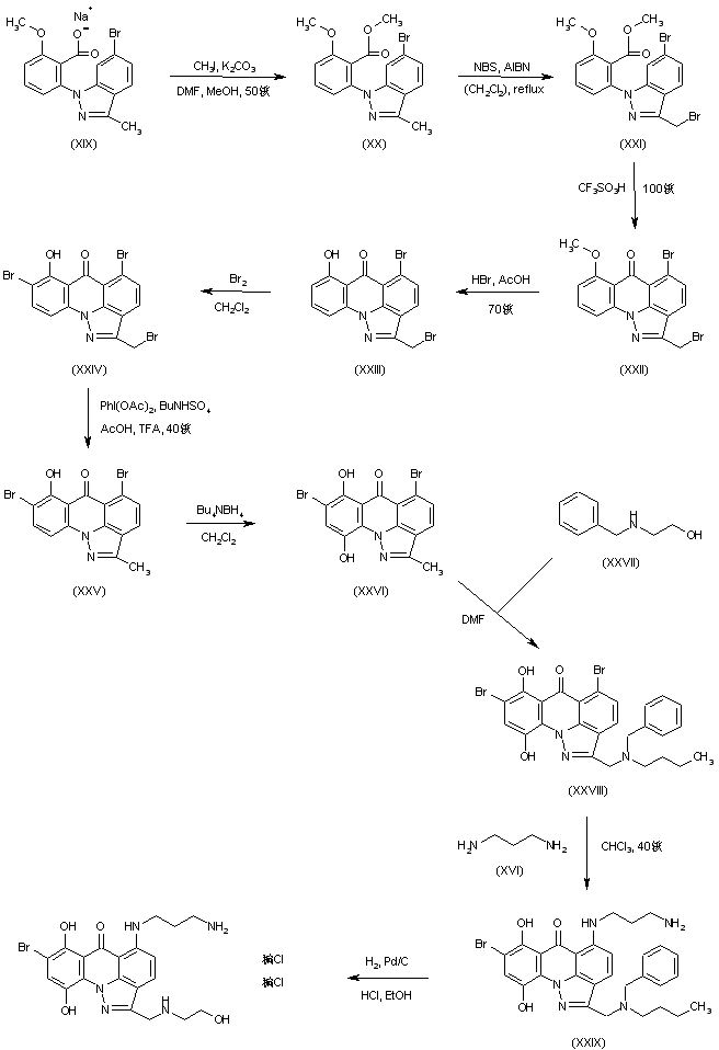 An improved synthesis of the title compound has been developed. Methyl ester (XX) was prepared from the known indazolylbenzoate sodium salt (XIX) by alkylation with iodomethane and K2CO3. Benzylic bromination of (XX) using NBS in the presence of AIBN as the radical initiator furnished the bromomethyl derivative (XXI). The brominated ester (XXI) was cyclized with trifluoromethanesulfonic acid at 100 C to provide the pyrazoloacridone (XXII) along with some phenol analogue (XXIII). Complete cleavage of the methyl ether of (XXII) was then accomplished with HBr in AcOH at 70 C. Further bromination of (XXIII) with elemental bromine in dichloroethane gave the ortho-bromophenol (XXIV). Introduction of the hydroxy group at C-10 was carried out by a two step sequence involving oxidation of (XXIV) to quinone (XXV) with (diacetoxy)iodobenzene, followed by its reduction to the corresponding hydroquinone (XXVI) with tetrabutylammonium triacetoxyborohydride. Condensation of (XXVI) with N-benzylethanolamine (XXVII) yielded the tertiary amine (XXVIII). Further bromine displacement in (XXVIII) with 1,3-propanediamine (XVI) provided (XXIX). The remaining bromine and the N-benzyl protecting groups of (XXIX) were finally subjected to hydrogenolysis in the presence of Pd/C