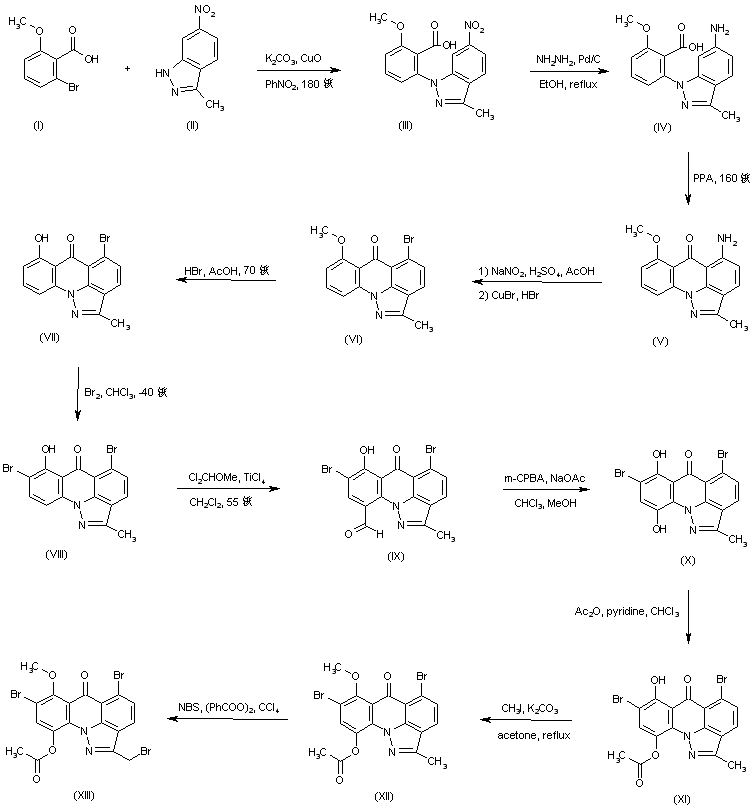Copper-catalyzed arylation of 3-methyl-6-nitroindazole (I) with 2-bromo-6-methoxybenzoic acid (II) furnished (III). Subsequent reduction of the nitro group of (III) to (IV) was effected by transfer hydrogenation with hydrazine hydrate in the presence of Pd/C. Intramolecular cyclization of carboxylic acid (IV) in hot PPA gave rise to the pyrazoloacridine system (V). The amino group of (V) was then converted to the bromide (VI) using a Sandmeyer reaction (1). Methyl ether cleavage in (VI) with HBr in hot AcOH provided phenol (VII), which was brominated with elemental bromine at low temperature to give (VIII). A formyl group was subsequently introduced in (VIII) by treatment with dichloromethyl methyl ether and TiCl4, yielding (IX). Oxidative cleavage of aldehyde (IX) under Baeyer-Villiger rearrangement conditions furnished the diphenol compound (X). Selective acetylation of one hydroxyl group of (X) affording (XI), followed by methylation of the remaining hydroxyl afforded (XII). Benzylic bromination of the side-chain methyl group of (XII) with NBS gave the bromomethyl derivative (XIII)