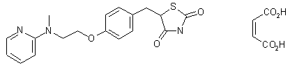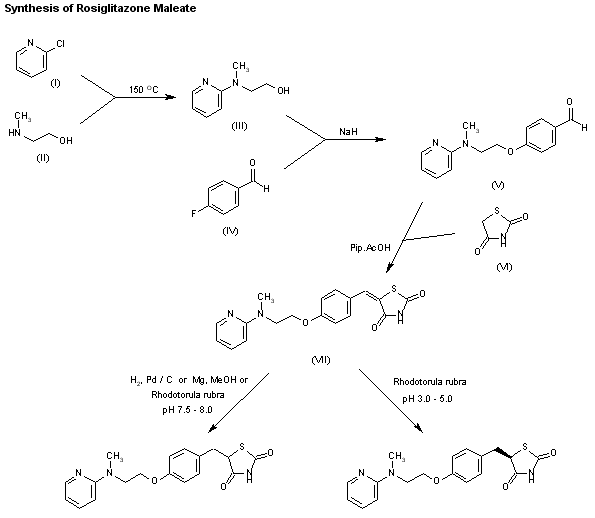 The reaction of 2-chloropyridine (I) with 2-(methyl-amino)ethanol (II) by heating at 150 C gives 2-[N-methyl-N-(2-pyridyl)amino]ethanol (III), which is condensed with 4-fluorobenzaldehyde (IV) by means of NaH in DMF, yielding 4-[2-[N-methyl-N-(2-pyridyl)amino]-ethoxy]benzaldehyde (V) (1-3). The reaction of (V) with thiazolidine-2,4-dione (VI) by means of piperidinium acetate in refluxing toluene affords 5-[4-[2-[N-methyl-N-(2-pyridyl)- amino]ethoxy]benzylidene]thiazolidine-2,4-dione (VII). Finally, this compound is reduced with H2 over Pd/C (1), Mg in methanol (2,3) or biocatalytically by incubation with whole cells of the yeast Rhodotorula rubra CBS 6469 at pH 7.5-8.0 (4-6). Under acidic conditions, pH 3.0-5.0, this microbial biotransformation is enantioselective, giving the (+)-(R)-enantiomer of rosiglitazone.
