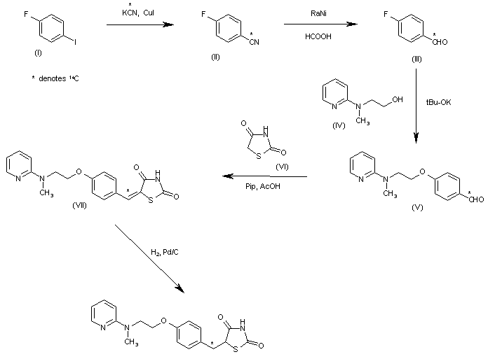 The reaction of 4-fluoroiodobenzene (I) with 14C-KCN and CuI in refluxing DMF gives 4-fluorobenzonitrile (II), which is reduced with HCO2H and RaNi in DMF to yield 4-fluorobenzaldehyde (III). The condensation of (III) with the substituted ethanolamine (IV) by means of tBu-OK in DMF affords 4-[2-[N-methyl-N-(2-pyridyl)amino]ethoxy]benzaldehyde (V), which is condensed with thiazolidine-2,4-dione (VI) by means of piperidine acetate in refluxing toluene to provide the benzylidene-thiazolidinedione (VII). Finally this compound is hydrogenated with H2 over Pd/C in DMF to furnish the target labeled compound.