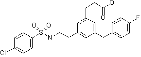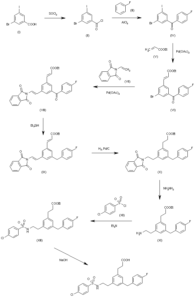 The reaction of 3-bromo-5-iodobenzoic acid (I) with SOCl2 gives the corresponding acyl chloride (II), which by a Friedel-Crafts condensation with fluorobenzene (II) by means of AlCl3 in refluxing dichloromethane yields the benzophenone (IV). The condensation of (IV) with ethyl acrylate (V) by means of palladium acetate and triethylamine in refluxing acetonitrile affords the cinnamic acid derivative (VI), which is condensed with N-vinylphthalimide (VII) by means of palladium acetate and diisopropylamine in refluxing xylene to provide the unsaturated adduct (VIII). The reduction of the carbonyl group of (VIII) with triethylsilane and TFA gives the diphenylmethane derivative (IX), which is hydrogenated with H2 over Pd/C in ethyl acetate to yield the saturated diphenylmethane derivative (X). Elimination of the phthalimido group of (X) with hydrazine affords (XI) with a primary amino group. that is sulfonated with 4-chlorophenylsulfonyl chloride (XII) and triethylamine in THF to provide the sulfonamide (XIII). Finally, the ester group of (XIII) is hydrolyzed with aqueous NaOH.